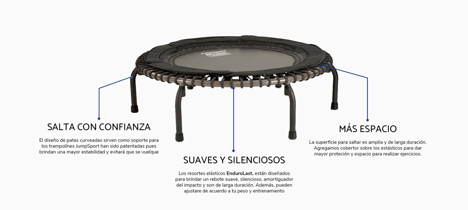 Descubre una nueva dimensión en el ejercicio con el trampolín JumpSport. Su tecnología EnduroLast absorbe hasta un 60% del impacto, brindando una experiencia de salto única y segura. Estimula tu bienestar de manera efectiva y divertida